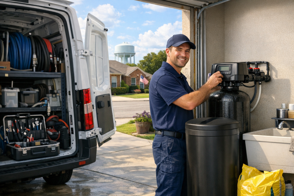 - Routine maintenance, salt delivery or refill guidance, and emergency repairs